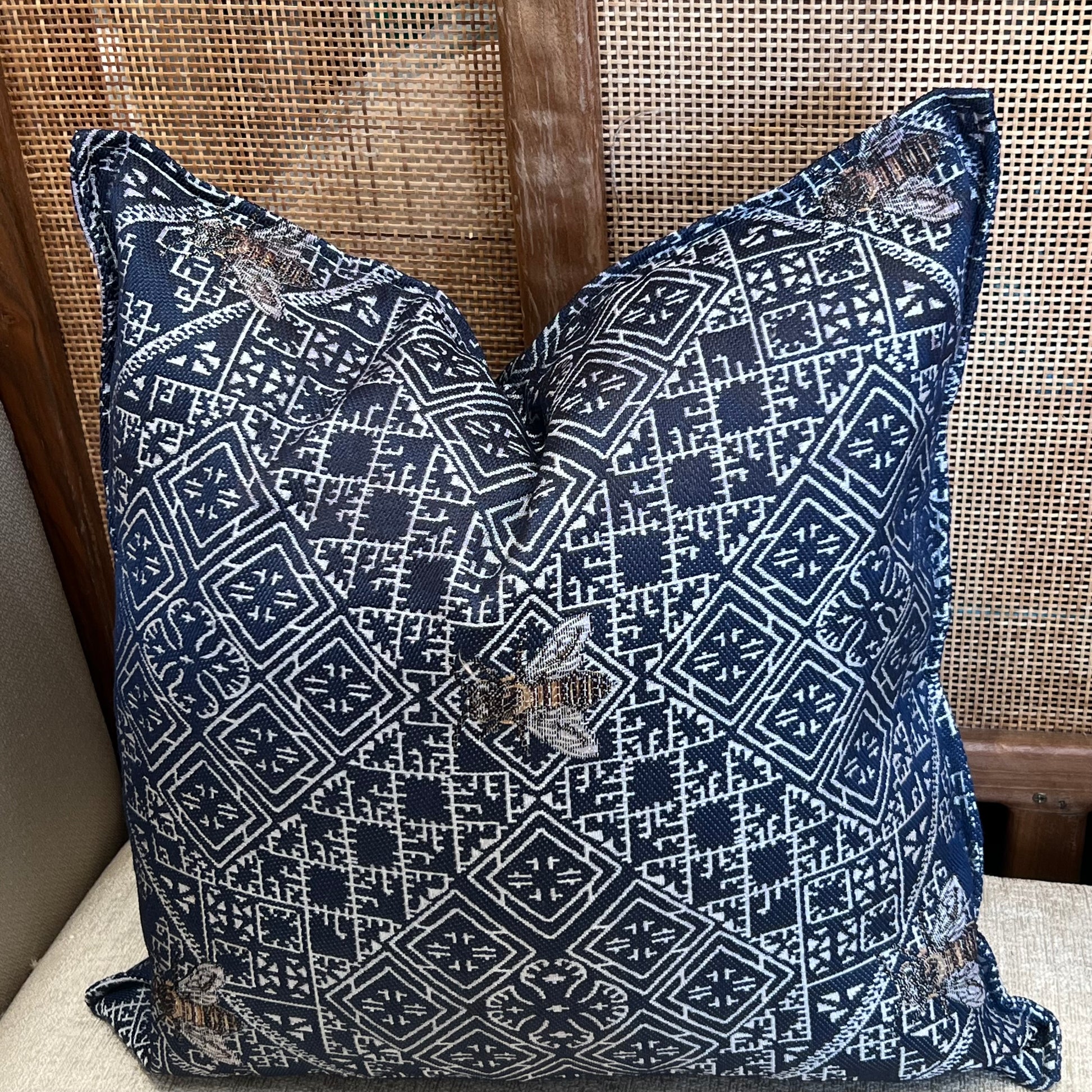 De délicates broderies d’abeilles dorées et argentées sont intégrées dans le motif, ajoutant une touche de luxe subtil et une finition digne de l’artisanat haut de gamme. Son garnissage généreux assure un confort optimal et une tenue impeccable, idéale pour sublimer un canapé, un fauteuil ou un espace lounge