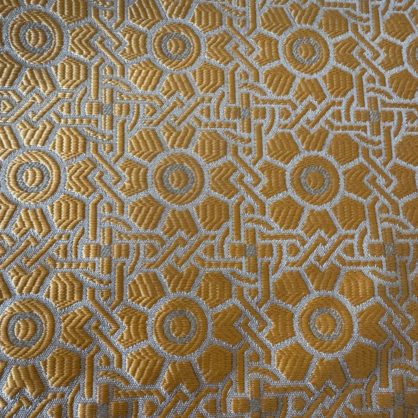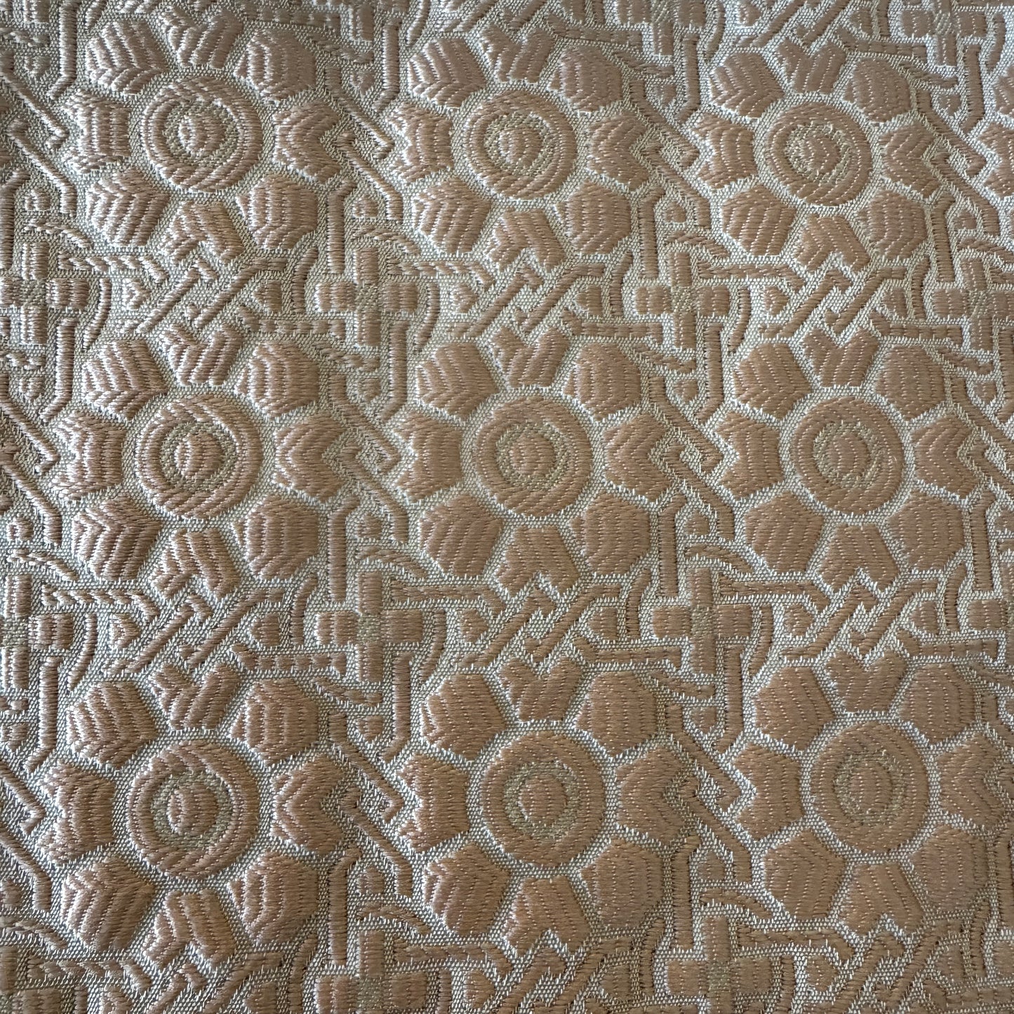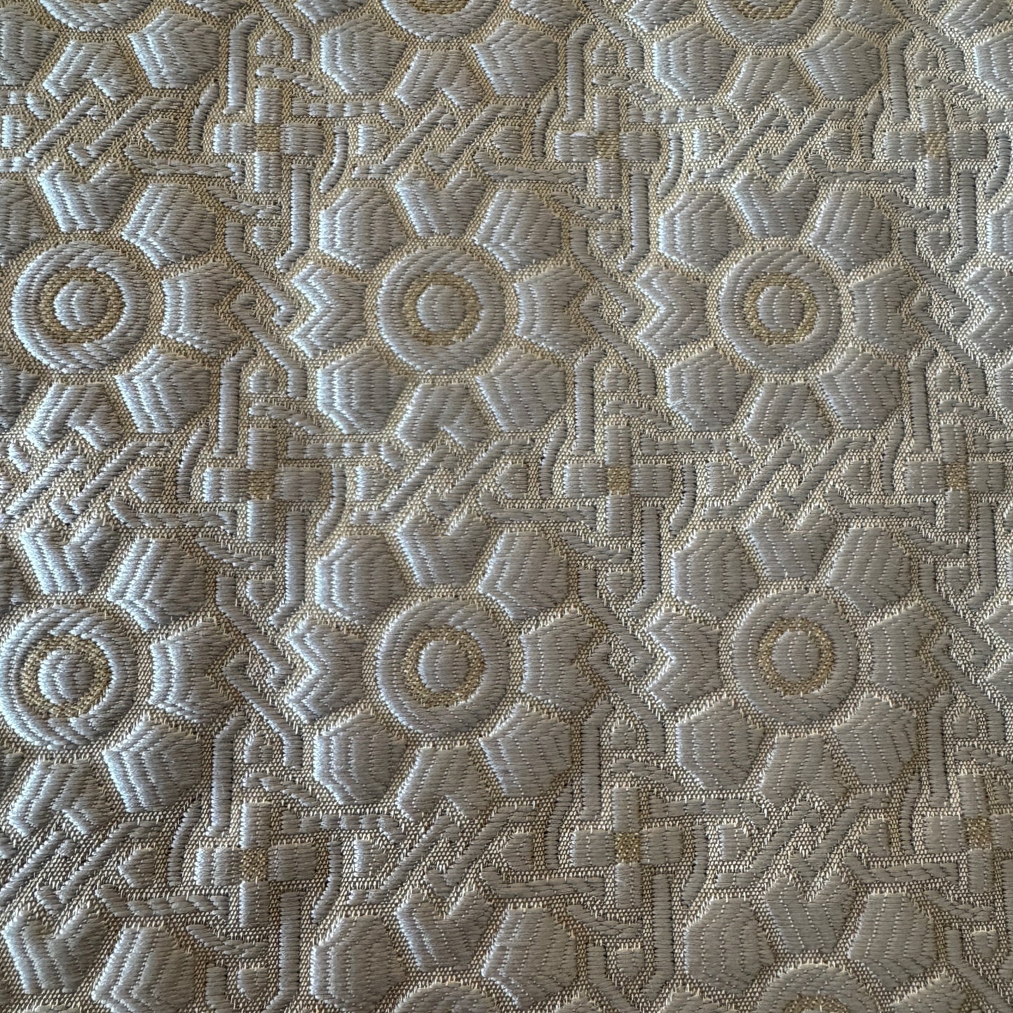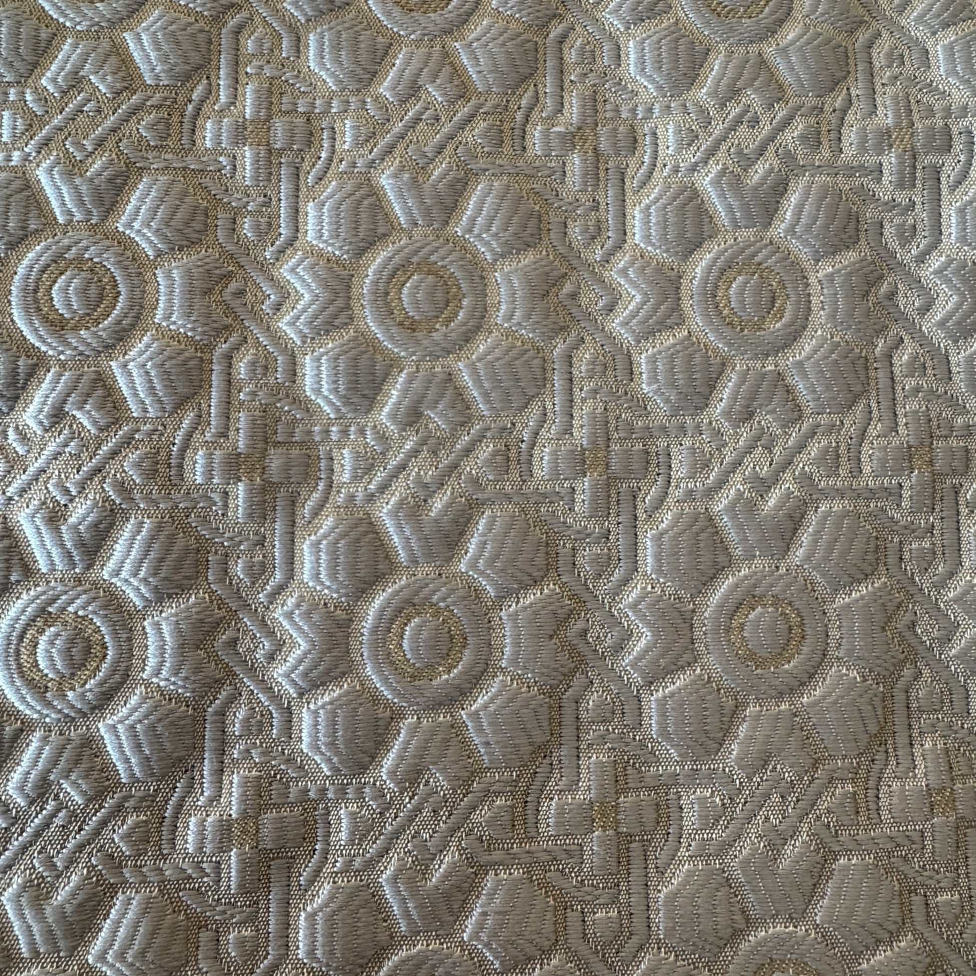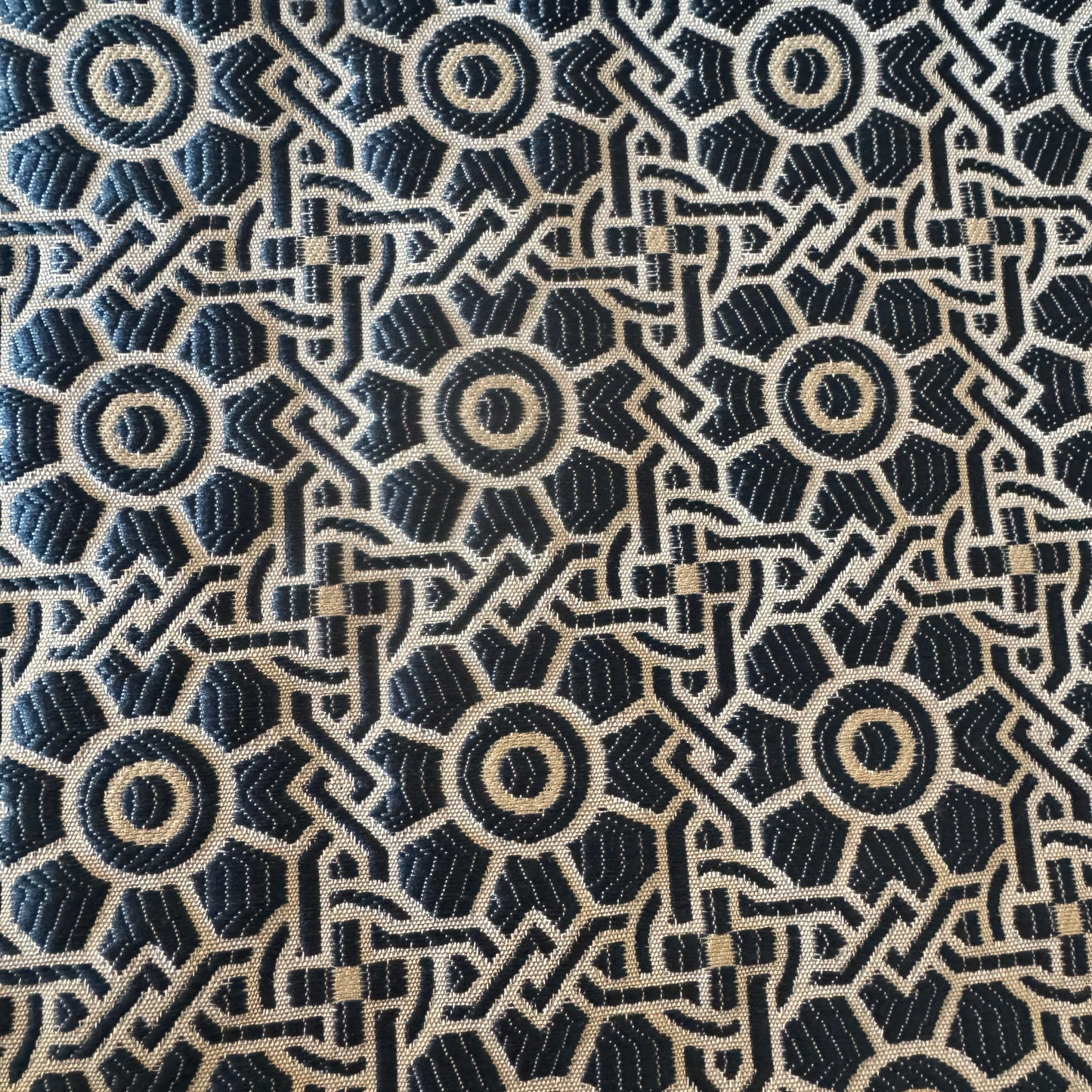 Ce tissu présente un motif géométrique raffiné, composé de formes entrelacées et de lignes nettes, créant un design à la fois moderne et élégant. L'association de couleurs noires profondes et de beiges clairs donne un contraste subtil, apportant de la profondeur au motif. La texture en relief ajoute une dimension visuelle et tactile qui enrichit l'aspect du tissu. Fabriqué avec un savoir-faire exceptionnel au Maroc, ce tissu incarne la qualité artisanale et la tradition. Il est idéal pour des applications décoratives dans un intérieur moderne ou marocain, que ce soit pour des coussins, des rideaux ou des revêtements de meubles. Ce tissu ajoute une touche de sophistication et de confort à n'importe quel espace, apportant élégance et caractère.